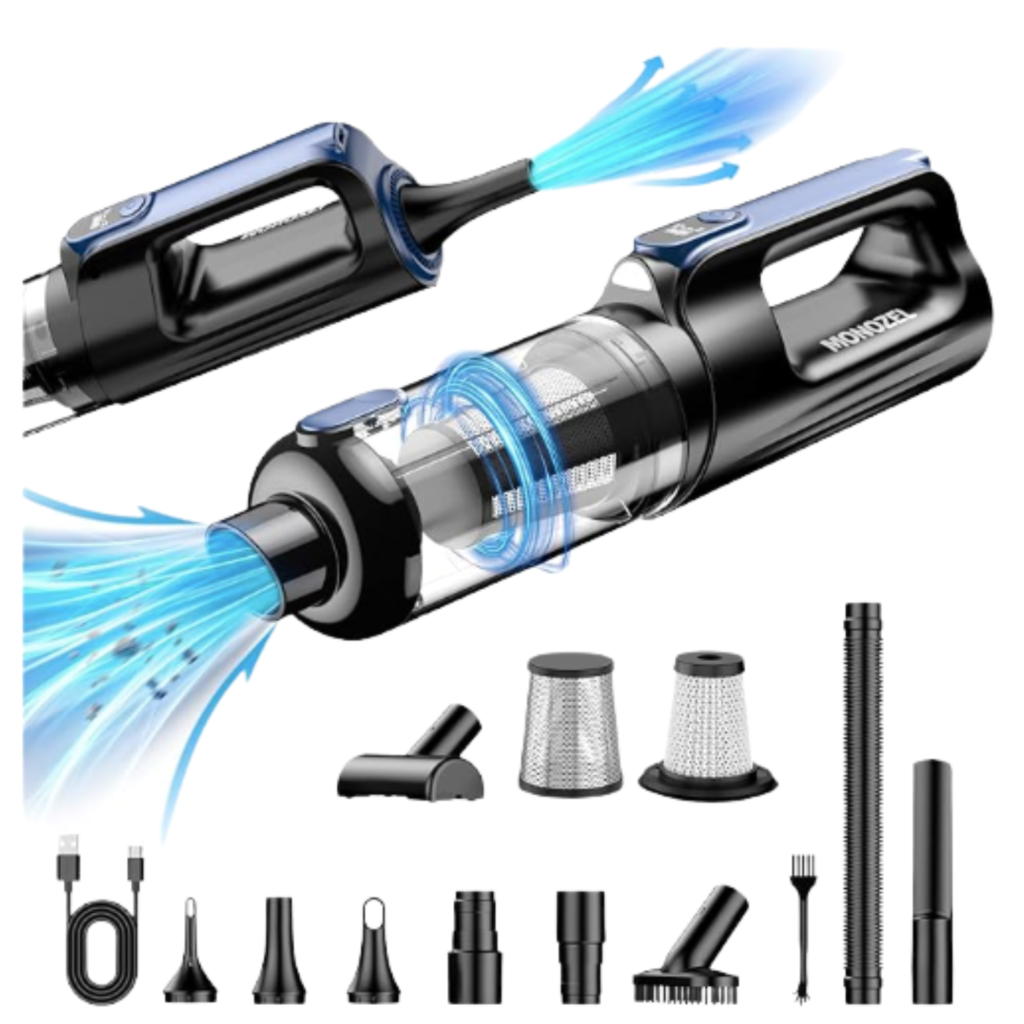 This handheld cordless vacuum is powerful yet compact — perfect for removing crumbs, dust, pet hair, and all the tiny messes that build up quickly. The LED light helps you see hidden dirt, and the different nozzles make it easy to clean tight spaces.