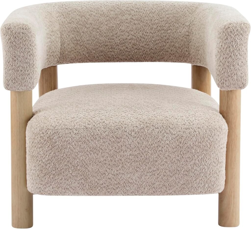 The soft boucle texture, the warm wood legs, the curved shape — it adds dimension and softness at the same time. It makes the room feel more “designed” without needing a lot of extra decor.