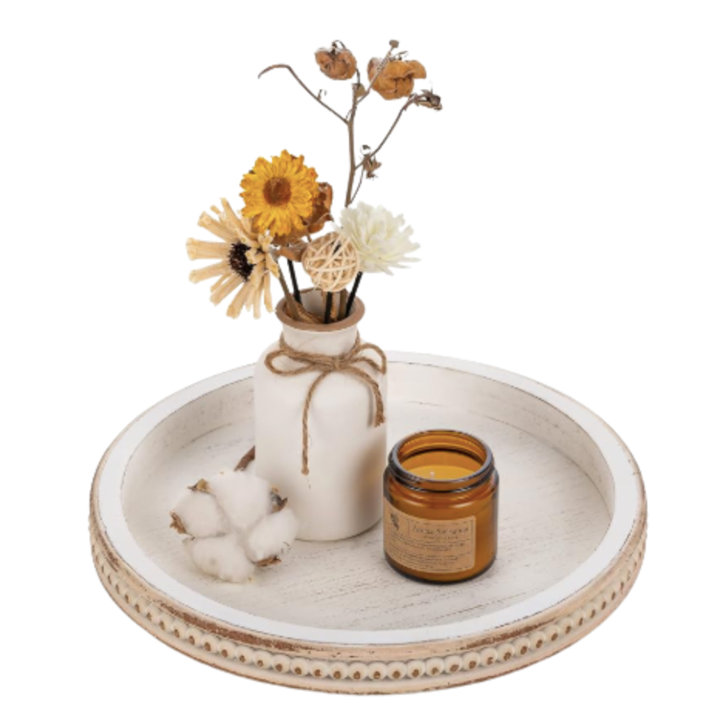 Nothing ties a space together like a pretty tray. This wooden beaded round tray is perfect for candles, flowers, perfumes, or as a coffee table centerpiece. It instantly adds charm and softness.