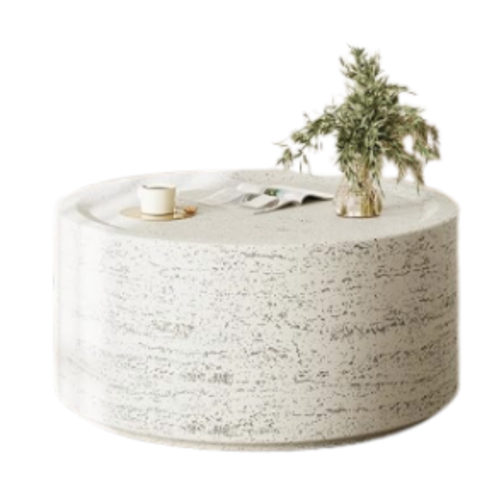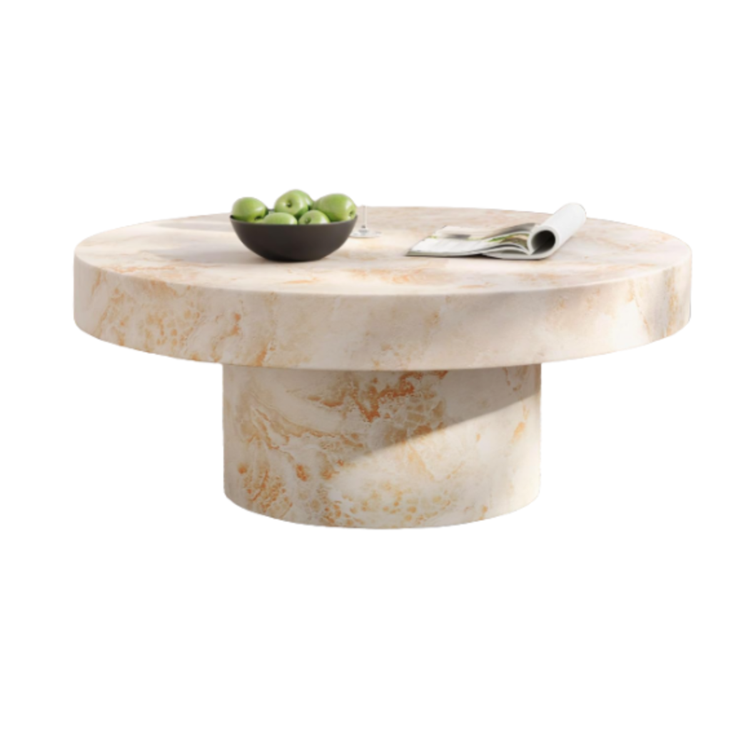This style features a thick round tabletop with a cylindrical base, creating a sculptural look that instantly adds character to your space. The faux stone finish brings warmth and texture while still keeping a clean, modern aesthetic.