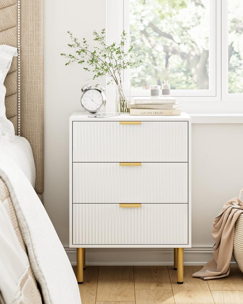 A clean, minimal nightstand like this one keeps everything organized while still adding a subtle design moment. The soft white with gold details adds just enough contrast to keep things interesting without breaking the neutral palette.