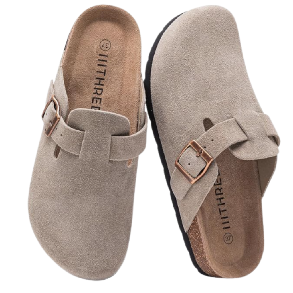 Suede clogs are everywhere right now — and for good reason. They’re comfortable, neutral, and give that effortless “clean girl meets cozy aesthetic” vibe. The cork footbed makes them supportive for daily wear, while the adjustable buckle adds both comfort and style.